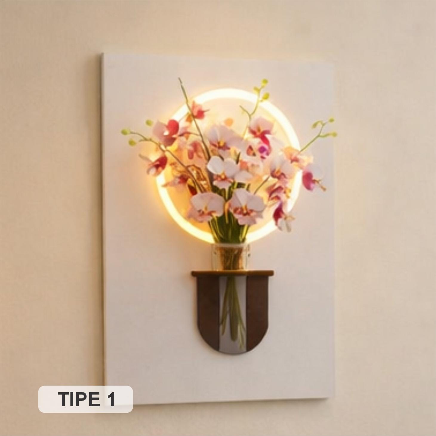 Wall decor modern dengan efek cahaya halo hangat yang menyatu dengan vas minimalis. Desainnya simpel namun elegan, cocok untuk mempercantik ruang tamu, kamar, atau area tangga agar terlihat lebih hidup dan estetik.