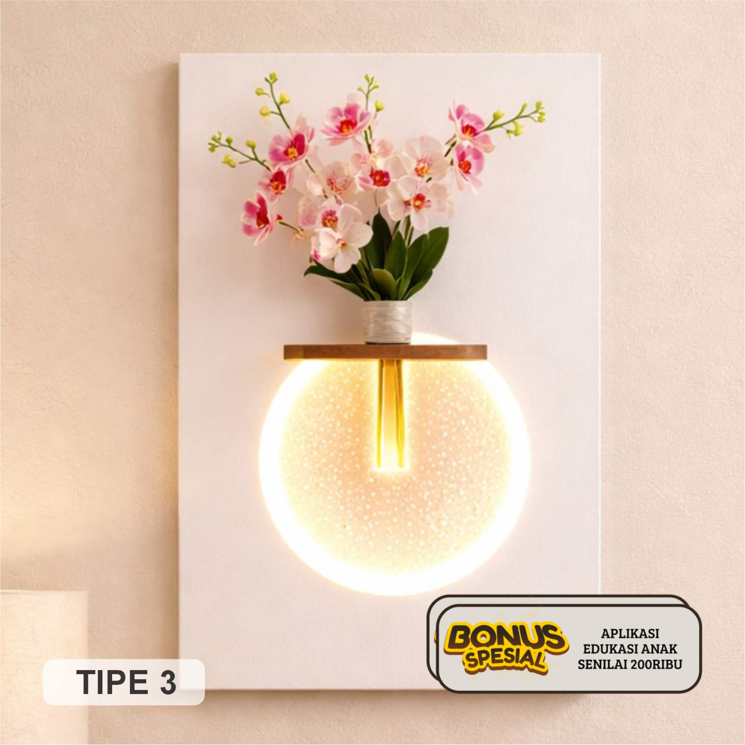 Lampu dinding berbentuk bulat dengan efek glowing lembut dan rak kayu natural di bagian atas. Kombinasi modern dan natural yang menciptakan suasana hangat dan nyaman.